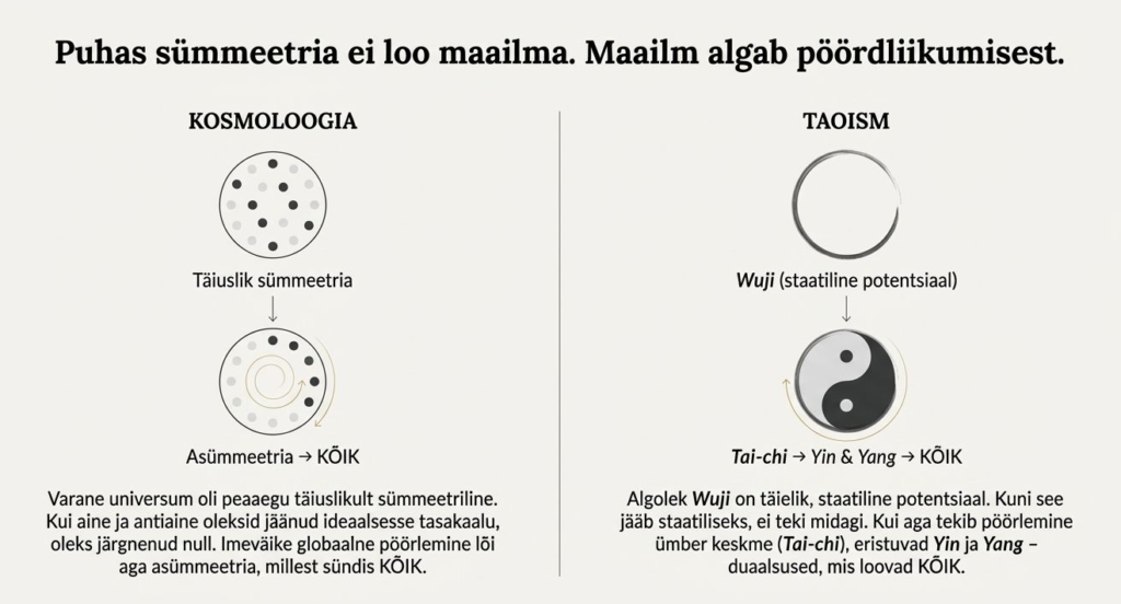 On haruldane, et kaasaegne kosmoloogiline hüpotees kõnetab seejuures nii selgelt tuhandeid aastaid vana filosoofilist maailmapilti taoistlikku „Wuji“ ja „Tai-chi“ ning „yin-yangi“ kontseptsiooni. Keeled on erinevad, meetodid on erinevad, aga sügav struktuur – see, kuidas „miski“ sünnib „mitte-miskist“ – kõlab hämmastavalt sarnaselt.